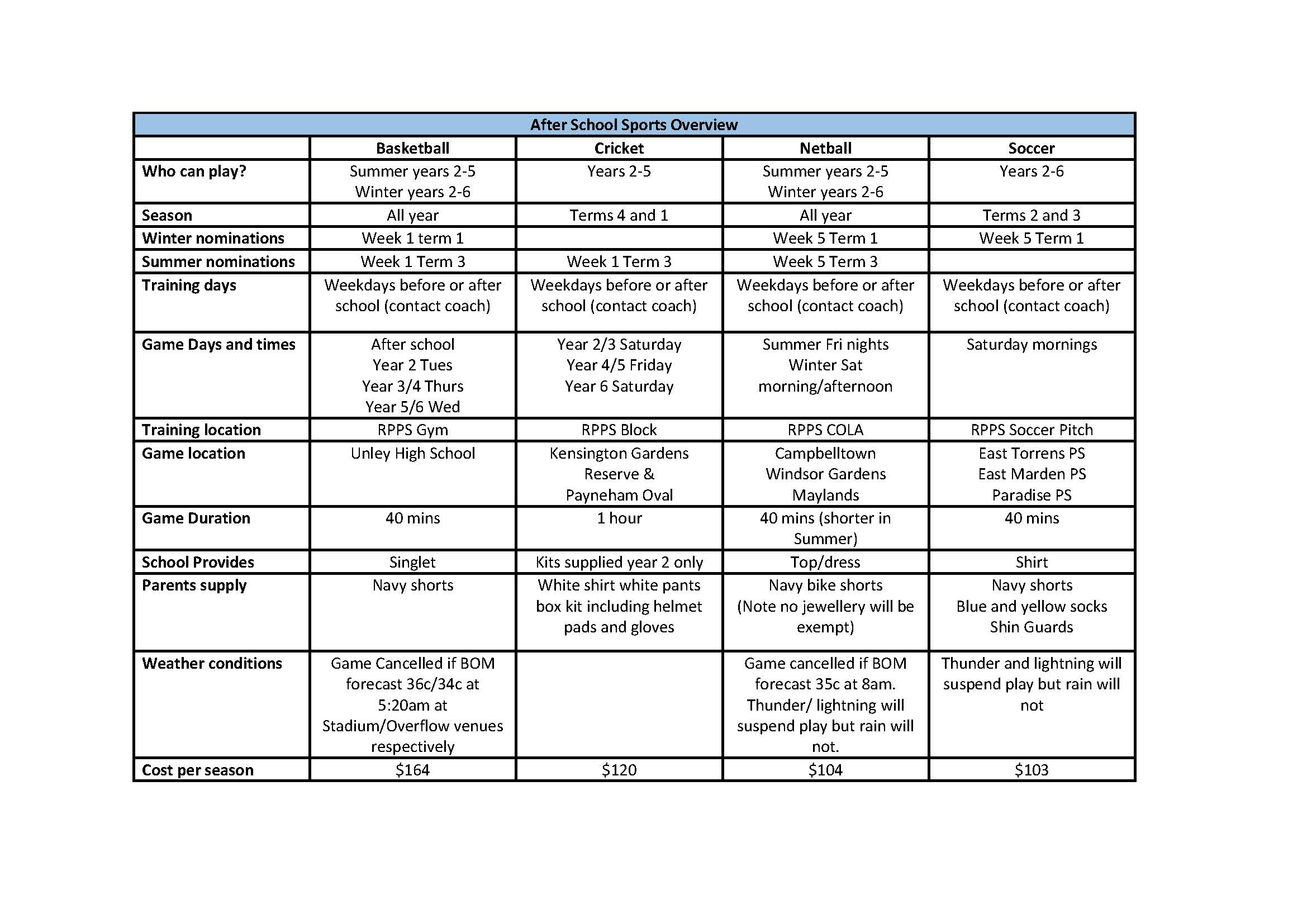 For more information please see the After School Sports Policy and Procedures or email Jack Aherne, After School Sports Officer at dl.0169.sportcoordinator@schools.sa.edu.au